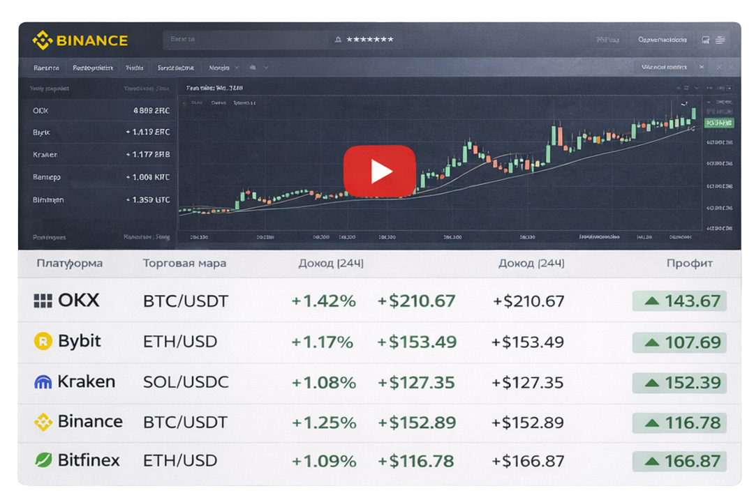 Торговые операции выполняются на спотовых рынках крупнейших криптовалютных бирж.